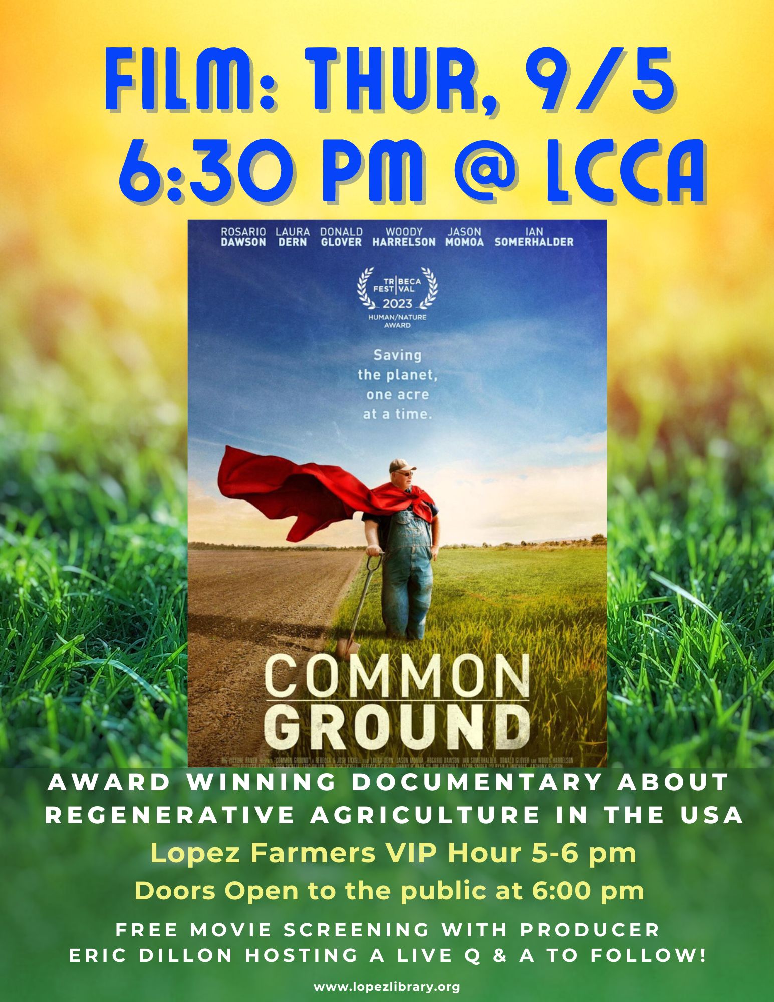 Come join us for a free showing of the award winning documentary film “Common Ground” on Thursday, Sept 5 beginning at 6:30 pm. There will be a Farmer’s VIP Hour from 5-6 pm and doors will open to the public at 6 pm. Producer of the film, Eric Dillon will have a live Question and Answer session following the film. We are so honored and excited to have Eric here on Lopez for this wonderful film!