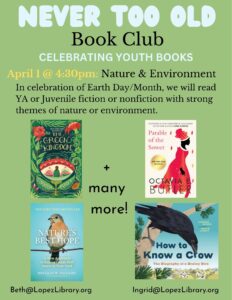 In celebration of Earth Day/Month, we’ll read Juvenile or Young Adult fiction or nonfiction with strong themes of nature and environment. A range of books are on the tower in the Young Adult room or view this booklist: https://lopezisland.biblionix.com/?booklist=157761