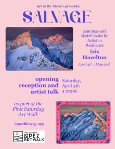 Coming up Saturday, April 4th! Start at the Lopez Library at 4:30 pm for an opening celebration featuring our current Artist in Residence. Iris Hazelton will discuss the exploration and experimentation that influence her compositions in oil and gouache.