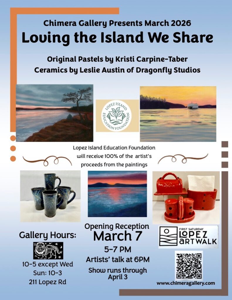 Chimera Gallery invites you to experience Loving the Island We Share, a new exhibition featuring the work of island artists Leslie Austin and Kristi Carpine-Taber. Through their distinct artistic voices, the exhibit reflects on the beauty, spirit, and shared sense of place that make Lopez Island such a special community.