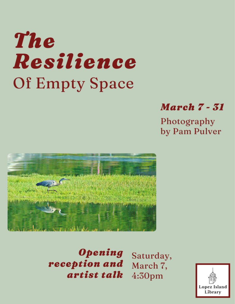 We are delighted to feature The Resilience of Empty Space, a photography exhibit by Lopez Island artist Pam Pulver, opening Saturday, March 7, 4:30pm.