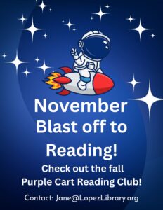 Purple Cart Reading Club 21Oct 20254 Dec 2025 Join the Fall Purple Cart Reading Club and blast off to reading! To learn more, contact Miss Jane: jane@lopezlibrary.org