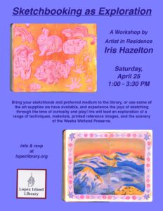 orkshop is for anyone who has every felt compelled to explore the visual language of drawing and painting, but felt daunted by the blank page. Beginning with a short presentation by Artist in Residence Iris Hazelton on the role sketchbooking plays in her practice, we will then explore a variety of mark making techniques and materials through the lens of curiosity and play. This offering will culminate with a walk down to Weeks Wetland Preserve, where we will leave our “art fear” behind and use our sketchbooks as tools of observation and representation. Bring your sketchbook and your preferred medium, or use some of the art supplies the library has available.